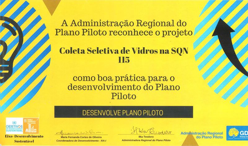 Temos a grata satisfação de informar que, a Comunidade da SQN 115 destinou, durante o período de 26/04/2019 a 10/12/2019, 15,2 Toneladas de vidro para reciclagem, contribuindo dessa forma com o aumento da vida útil do Aterro Sanitário de Brasília e com o desenvolvimento sustentável da nossa cidade. Este é nosso ponto de partida rumo ao “Lixo Zero”;